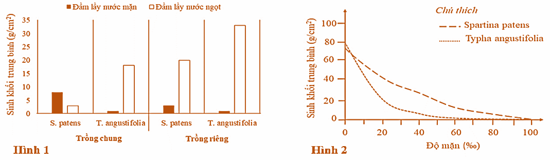 | c) ở đầm lầy nước ngọt, loài S. patens có ưu thế cạnh tranh tốt hơn loài T. angustifolia. | ||