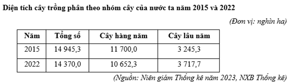 [(Tỉ trọng diện tích cây công nghiệp lâu năm năm 2022/Tổng diện tích cây trồng 2022)*100] – [(Tỉ trọng diện tích cây công nghiệp lâu năm năm 2015/Tổng diện tích cây trồng 2015)*100]