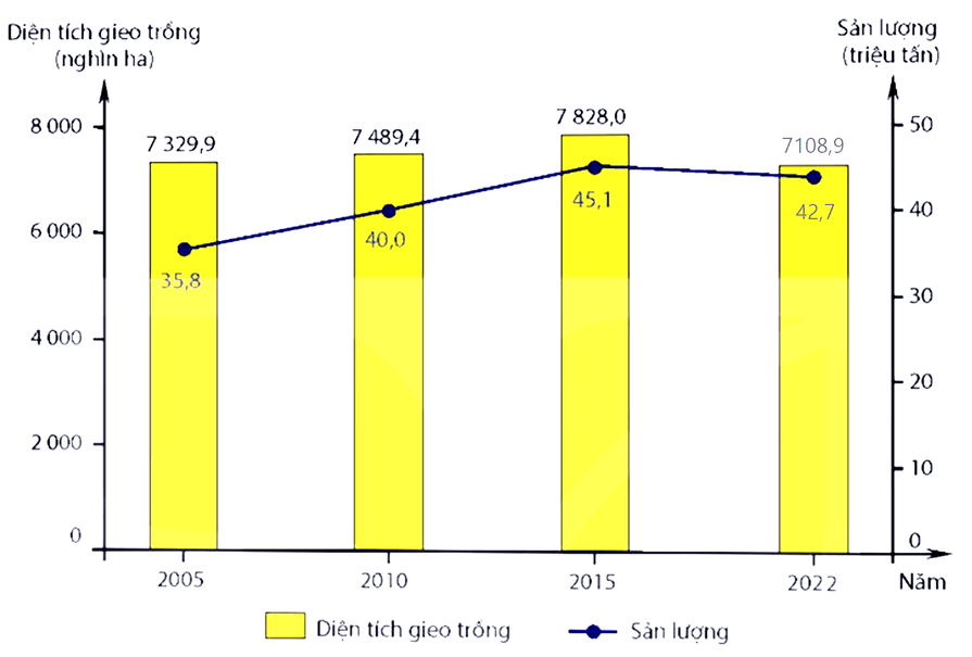 Cho biểu đồ về diện tích gieo trồng và sản lượng lúa của nước ta giai đoạn 2005 -2022