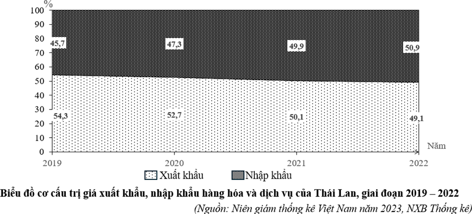 | a) Giai đoạn 2019 - 2022, tỉ trọng xuất khẩu luôn lớn hơn tỉ trọng nhập khẩu. | ||