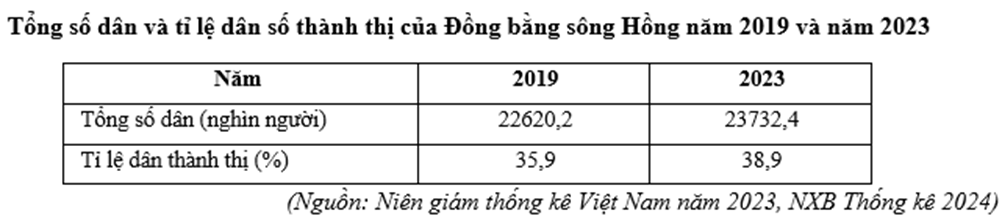 Căn cứ vào bảng số liệu, hãy cho biết số dân thành thị của Đồng bằng sông Hồng năm 2023 so với năm 2019 tăng thêm bao nhiêu nghìn người? (làm tròn kết quả đến hàng đơn vị)