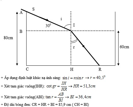 Một bể nước có thành cao 80 cm, ánh sáng chiếu theo phương nghiêng góc so với mặt nước trong bể. Hãy vẽ hình và xác định độ dài bóng đen ở đáy bể khi chiều cao lớp nước trong bể là 60 cm. cho biết chiết suất của nước là n = 4/3.