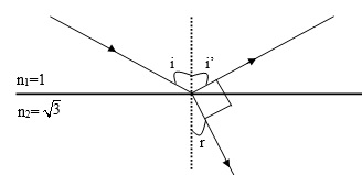 Một tia sáng đơn sắc truyền từ môi trường không khí vào môi trường trong suốt có chiết suất tuyệt đối là . Tìm góc tới và góc khúc xạ để tia khúc xạ vuông góc với tia phản xạ (có vẽ hình)