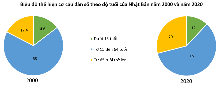 a) Vẽ biểu đồ tròn thể hiện cơ cấu dân số theo độ tuổi của Nhật Bản năm 2000 và năm 2020.