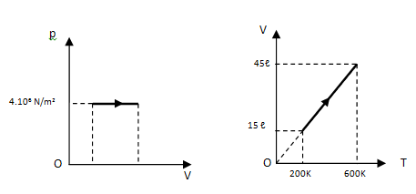 Một lượng khí lí tưởng chứa trong một xi lanh có pittông dịch chuyển được. Các thông số trạng thái ban đầu của khối khí trên là: Áp suất 4.10 6 N/m2, thể tích 15 lít, nhiệt độ tuyệt đối 200K. Đun nóng đẳng áp làm thể tích khí trong bình tăng gấp 3 so với ban đầu.