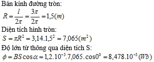 Cho một sợi dây đồng mỏng dài 3p m. Ta uốn nó thành một vòng tròn và đặt vuông góc với từ trường đều có cảm ứng từ B = 1,2.10-3 T. Tính độ lớn của từ thông gửi qua diện tích giới hạn bởi vòng dây.