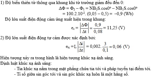 a/ Một khung dây phẳng gồm 100 vòng dây, diện tích mỗi vòng dây là 2 dm2 đặt trong một từ trường có các đường sức từ vuông góc với mặt phẳng vòng dây. Nếu trong khoảng thời gian 0,08 s, độ lớn của cảm ứng từ giảm đều từ 0,5 T về 0,05 T thì suất điện động cảm ứng xuất hiện trong khung dây trên có độ lớn bao nhiêu? (1 đ)