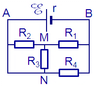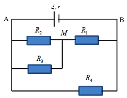 Cho mạch điện như hình vẽ. Trong đó \(\xi = 6\,\,V;\,\,r = 0,5\,\,\Omega ;\,\,{R_1} = 1\,\,\Omega ;\,\,{R_2} = {R_3} = 4\,\,\Omega ;\,\,{R_4} = 6\,\,\Omega \).