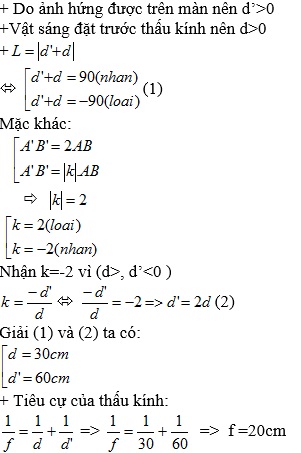 Cho một thấu kính hội tụ. Một vật sáng AB đặt trước thấu kính cho ảnh cao gấp 2 lần vật và cách vật 90 cm. Biết ảnh hứng được trên màn (ảnh thật). Xác định tiêu cự của thấu kính.