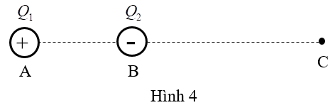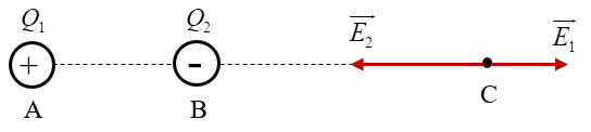 Trong chân không, xét ba điểm thẳng hàng theo thứ tự A, B, C với AB = 2 cm; BC = 3 cm. Lần lượt đặt các điện tích điểm \({Q_1} = {10^{ - 9}}C\) và \({Q_2} = - {3.10^{ - 9}}C\) tại A và B như hình 4. Cho hệ số tỉ lệ \(k = {9.10^9}N.{m^2}/{C^2}\). Tính độ lớn cường độ điện trường tổng hợp do \({Q_1}\) và \({Q_2}\) gây ra tại điểm C.