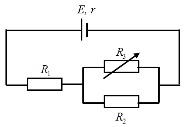 Cho sơ đồ mạch điện như hình vẽ: \(E = 12V,r = 5\Omega ,{R_1} = 3\Omega ,{R_2} = 6\Omega ,{R_3}\) là một biến trở:
