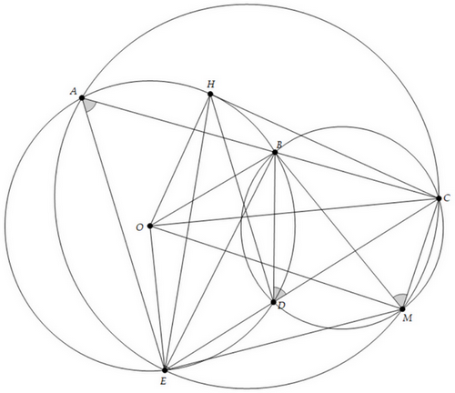 b) Các đường tròn ngoại tiếp các tam giác \(BCD\) và \(ACE\) cắt nhau tại giao điểm thứ hai \(M\). Biết rằng bốn điểm \(O,B,M,E\) tao thành tứ giác \(OBME\). Chứng minh rằng: Tứ giác \(OBME\) nội tiếp.