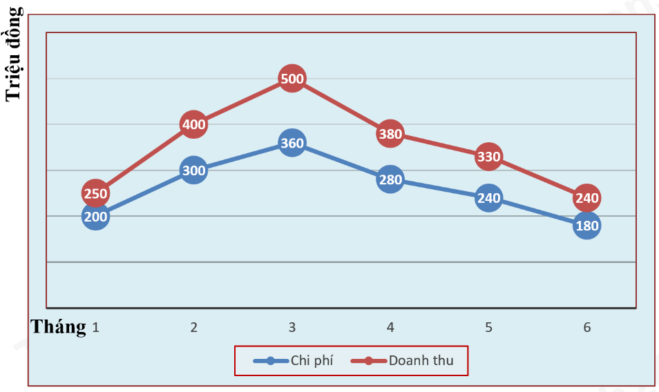 Biểu đồ sau thể hiện chi phí sản xuất và doanh thu bán hàng của một cơ sở kinh doanh trong 6 tháng đầu năm 2024. Biết cơ sở này chỉ sản xuất một loại sản phẩm. Đơn vị: triệu đồng.