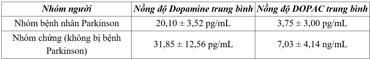 Nghiên cứu nồng độ Dopamine cùng các chất chuyển hóa của Dopamine (DOPAC) trong dịch não tủy và mối liên quan với một số biểu hiện lâm sàng ở bệnh nhân mắc bệnh Parkinson. Xét nghiệm định lượng nồng độ Dopamine, DOPAC dịch não tủy cho cả nhóm bệnh và nhóm chứng (không bị bệnh nghiên cứu). Kết quả theo bảng sau: