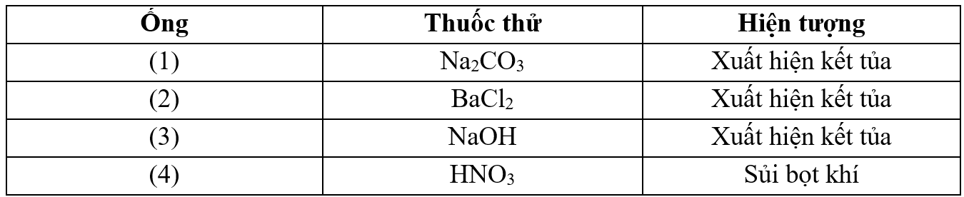 Một mẫu nước được thử nghiệm định tính để xác định sự có mặt của một số ion. Mẫu mước được cho vào 4 ống nghiệm, sau đó nhỏ mỗi loại thuốc thử vào mỗi ống nghiệm và ghi nhận hiện tượng như hàng dưới đây: