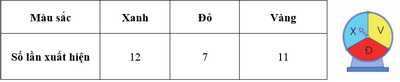 Minh chơi một vòng quay có 3 màu xanh, đỏ, vàng. Minh quay vòng quay 30 lần và ghi lại số lần kim dừng lại ở mỗi màu như sau: