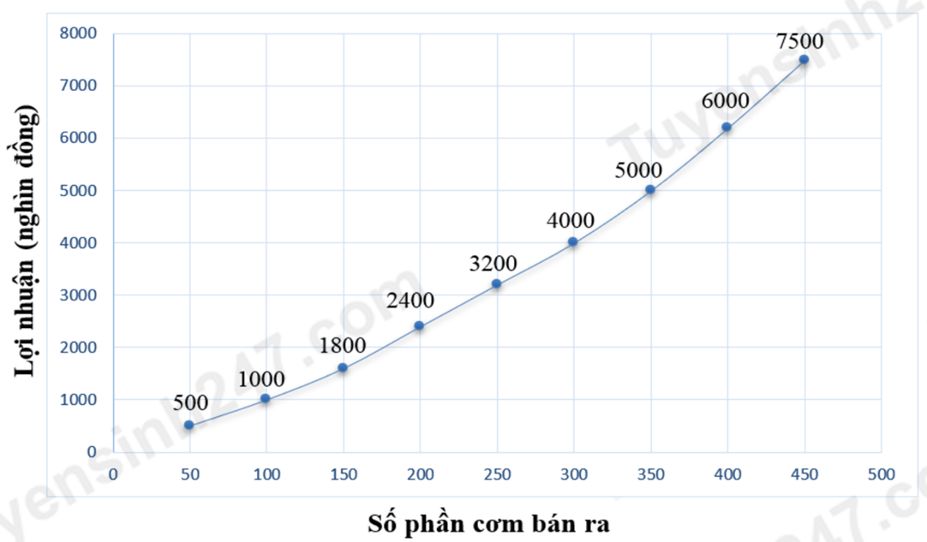 Biểu đồ sau thể hiện mối liên hệ giữa lợi nhuận và số phần cơm bán ra trong một ngày của một cơ sở suất ăn công nghiệp.