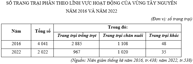 Nhận xét nào sau đây đúng về số trang trại phân theo lĩnh vực hoạt động của vùng Tây Nguyên năm 2016 và năm 2022?