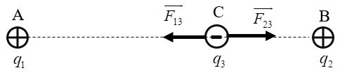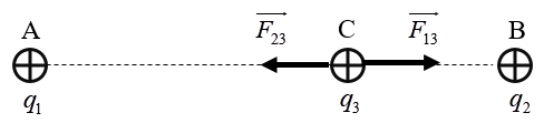 | c) Khi đặt điện tích điểm \({q_3}\) tại C, với CA = 8 cm, C nằm trên đoạn AB thì \({q_3}\) cân bằng. | ||
