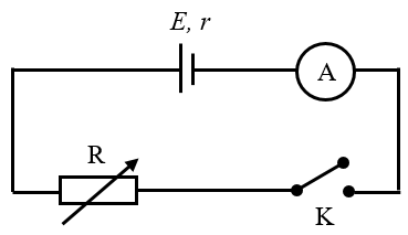 Cho mạch điện có sơ đồ như hình vẽ: Suất điện động của nguồn là E = 12 V, điện trở trong \(r = 1\,\,\Omega \), biến trở R. Bỏ qua điện trở dây nối và ampe kế.