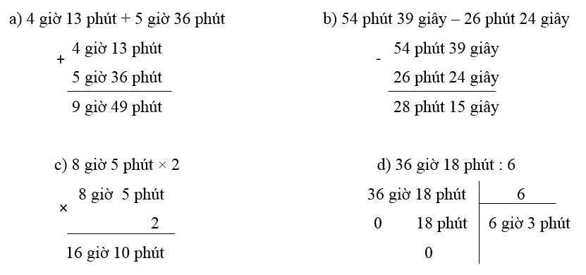 Tính: a) 4 giờ 13 phút + 5 giờ 36 phút b) 54 phút 39 giây – 26 phút 24 giây c) 8 giờ 5 phút × 2 d) 36
