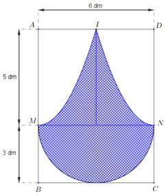 Để trang trí một bảng gỗ hình chữ nhật ABCD có chiều dài \(AB = 8{\rm{dm}}\) và chiều rộng \(AD = 6{\rm{dm}}\), người ta thiết kế một logo là hình phẳng giới hạn bởi nửa đường tròn đường kính \(MN = 6{\rm{dm}}\), tiếp xúc với BC; hai đường cong IM, IN là một phần của các đường parabol lần lượt có đinh là các điểm M, N và parabol có trục đối xứng lần lượt là AB, CD, với I là trung điểm của AD (tham khảo hình vẽ). Phần logo được sơn màu xanh với chi phí 50000 đồng \(/1{\rm{d}}{{\rm{m}}^2}\) và phần còn lại của bảng gỗ được sơn màu trắng với chi phí 30000 đồng \(/1{\rm{d}}{{\rm{m}}^2}\). Hỏi cần bỏ ra bao nhiêu nghìn đồng để trang trí bảng gỗ trên (kết quả làm tròn đến hàng đơn vị)?