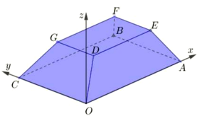 Hình vẽ bên minh hoạ hình ảnh một toà nhà trong không gian với hệ toạ độ Oxyz (đơn vị trên mỗi trục toạ độ là mét). Biết OABC.DEFG là hình chóp cụt có hai đáy nằm trên hai mặt phẳng song song, OABC là hình chữ nhật nằm trong mặt phẳng \((Oxy)\), \(OA = 100\;{\rm{m}}\), \(OC = 60\;{\rm{m}}\) và điểm \(D(10;10;8)\). Khoảng cách từ B đến mặt phẳng \((OCGD)\) bằng bao nhiêu mét (kết quả làm tròn đến hàng phần chục)?