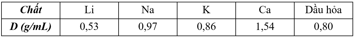 Cho khối lượng riêng của các chất như bảng sau:Để bảo quản một số kim loại mạnh, người