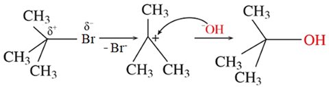 \({{\rm{(C}}{{\rm{H}}_3})_3}{\rm{C}} - {\rm{Br}} + {\rm{NaOH }} \to {{\rm{(C}}{{\rm{H}}_3})_3}{\rm{C}} - {\rm{OH}} + {\rm{NaBr}}\). Cơ chế phản ứng xảy ra theo hai giai đoạn sau:
