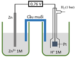 Cho pin điện hóa được thiết lập bởi điện cực Zn và điện cực hydrogen (cấu tạo như hình vẽ) dung dịch Zn (aq) 1 M và dung dịch H+ (aq) 1 M có thể tích bằng nhau, sức điện động chuẩn của pin đo được là 0,76 V.