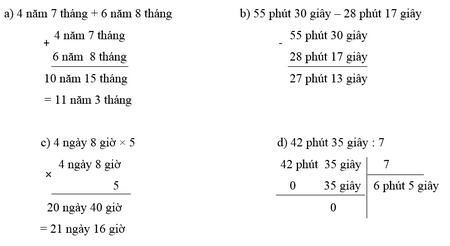 Tính:a) 4 năm 7 tháng + 6 năm 8 tháng b) 55 phút 30 giây – 28 phút 17 giâyc) 4 ngày 8 giờ × 5 d)