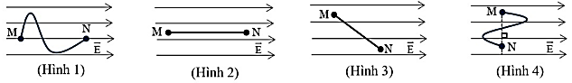 Điện tích q chuyển động trong điện trường đều từ điểm M đến điểm N lần lượt theo các quỹ đạo được mô tả bằng đường nét liền đậm như các hình vẽ dưới đây. Điện tích q đi theo quỹ đạo như hình vẽ nào thì lực điện trường không sinh công?