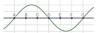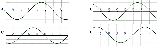 Một sóng hình sin truyền trên một sợi dây với chu kì T theo chiều từ A đến G. Ở thời điểm t = 0, hình dạng sợi dây như hình bên