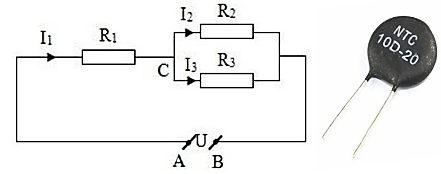 | d) Thay thế điện trở \({R_1}\) bằng điện trở nhiệt như hình bên. Khi làm tăng nhiệt độ của điện trở nhiệt thì cường độ dòng điện \({I_1}\) giảm. |