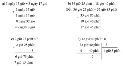 Tính:a) 5 ngày 15 giờ + 3 ngày 17 giờ b) 36 giờ 25 phút – 18 giờ 40 phútc) 2 giờ 25 phút × 3