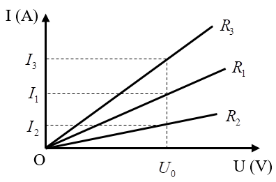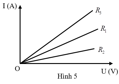 Đường đặc trưng vôn – ampe của dòng điện chạy qua các điện trở \({R_1};\,\,{R_2};\,\,{R_3}\) được biểu diễn như Hình 5. Kết quả so sánh các giá trị điện trở là