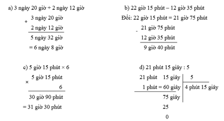 Tính:a) 3 ngày 20 giờ + 2 ngày 12 giờ b) 22 giờ 15 phút – 12 giờ 35 phútc) 5 giờ 15 phút × 6