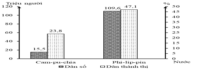 Cho biểu đồ: SỐ DÂN VÀ TỈ LỆ DÂN THÀNH THỊ CỦA CAM-PU-CHIA VÀ PHI-LIP-PIN NĂM 2020 (Nguồn số