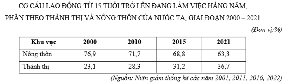 | a) Để thể hiện cơ cấu lao động từ 15 tuổi trở lên đang làm việc hàng năm, phân theo thành thị và nông thôn của nước ta, giai đoạn 2000 - 2021, biểu đồ đường là thích hợp nhất. | ||