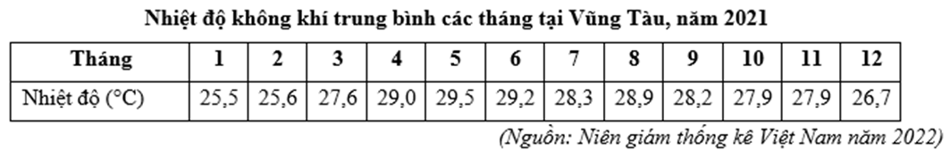 Cho bảng số liệu: Cho biết nhiệt độ trung bình năm 2021 tại Vũng Tàu là bao