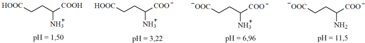 Glutamic acid có các dạng tồn tại và giá trị pH mà dạng tồn tại đó là chủ yếu (≈ 100%) như sau: