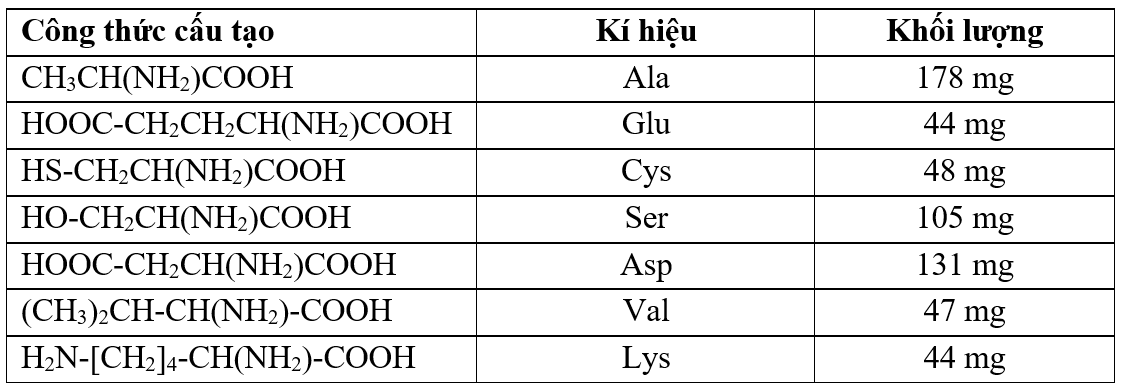Khi thuỷ phân hoàn toàn 500 mg một protein, chỉ thu được các amino acid với khối lượng như sau: