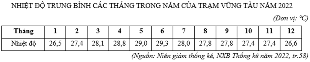 Căn cứ bảng số liệu trên, tính biên độ nhiệt trung bình năm của trạm Vũng Tàu (đơn vị tính: °C, làm tròn kết quả đến một chữ số của phần thập phân).