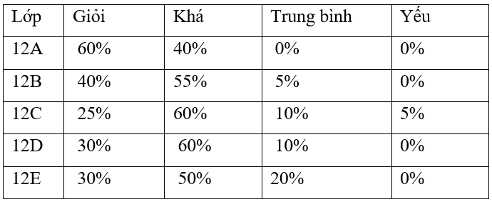 Biết tỉ lệ số học sinh của lớp 12A, 12B, 12E là 9:8:6. Hỏi số học sinh khá chiếm khoảng bao nhiêu phần trăm tổng số học sinh ba lớp đó?