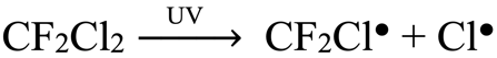 Tầng ozone hoạt động như một tấm lá chắn ngăn chặn phần lớn các tia cực tím không cho chúng đến bề mặt Trái Đất. Tuy nhiên, CF2Cl2 (thuộc nhóm freon thoát ra từ các thiết bị làm lạnh trước đây) đã và đang dần bào mòn và làm thủng tầng ozone. Khi khuếch tán lên tầng cao của khí quyển, CF2Cl2 bị tia cực tím phân cắt tạo ra nguyên tử Cl● (gốc tự do) theo phương trình hoá học: