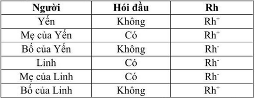 Yếu tố Rh do gene R quy định, kiểu gene của người Rh- là rr và của người Rh là RR hoặc Rr. Khi một người phụ nữ Rh- mang thai nhi có Rh+, hệ miễn dịch của người phụ nữ có thể tạo ra các kháng thể kháng lại Rh+ của thai nhi trong lần mang thai thứ hai, có thể dẫn đến cái chết của thai nhi. Hiện tượng này được gọi là sự không tương thích Rh. Hai gene này cùng nằm trên một cặp nhiễm sắc thể thường và cách nhau 40cM. Hai vợ chồng là Yến và Linh đến một văn phòng tư vấn di truyền và được bác sĩ thu thập dữ liệu như tóm tắt trong bảng dưới đây: