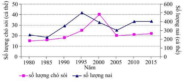 Quan hệ giữa các loài góp phần quan trọng đảm bảo cân bằng sinh học của quần xã. Khi nghiên cứu biến động số lượng cá thể của quần thể nai và chó sói trên một hòn đảo từ năm 1980 đến năm 2015, các nhà nghiên cứu đã thu được kết quả như hình bên.
