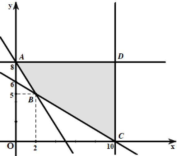 Người ta dùng hai loại nguyên liệu để chiết xuất ít nhất 200 kg hóa chất A và 24 kg hóa chất B. Từ mỗi tấn nguyên liệu loại I có thể chiết xuất được 40 kg hóa chất A và 2,4 kg hóa chất B. Từ mỗi tấn nguyên liệu loại II có thể chiết xuất được 25 kg hóa chất A và 4 kg hóa chất B. Biết rằng cơ sở cung cấp nguyên liệu chỉ có thể cung cấp không quá 10 tấn nguyên liệu loại I và không quá 8 tấn nguyên liệu loại II. Gọi \(x,y\) (tấn) lần lượt là khối lượng nguyên liệu loại I và loại II đã dùng.