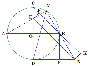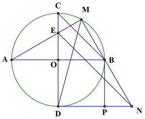 2) Cho \((O)\) đường kính \(AB\). Kẻ đường kính \(CD\) vuông góc với \(AB\). Lấy \(M\) thuộc cung nhỏ \(BC\), \(AM\) cắt \(CD\) tại \(E\). Qua \(D\) kẻ tiếp tuyến với \((O)\)cắt đường thẳng \(BM\) tại \(N\). Gọi \(P\) là hình chiếu vuông góc của \(B\) lên \(DN\)