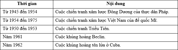 | a) Bảng tư liệu đề cập đến những cuộc chiến tranh cục bộ, xung đột trong khuôn khổ Chiến tranh lạnh. | ||